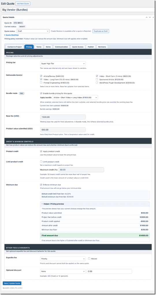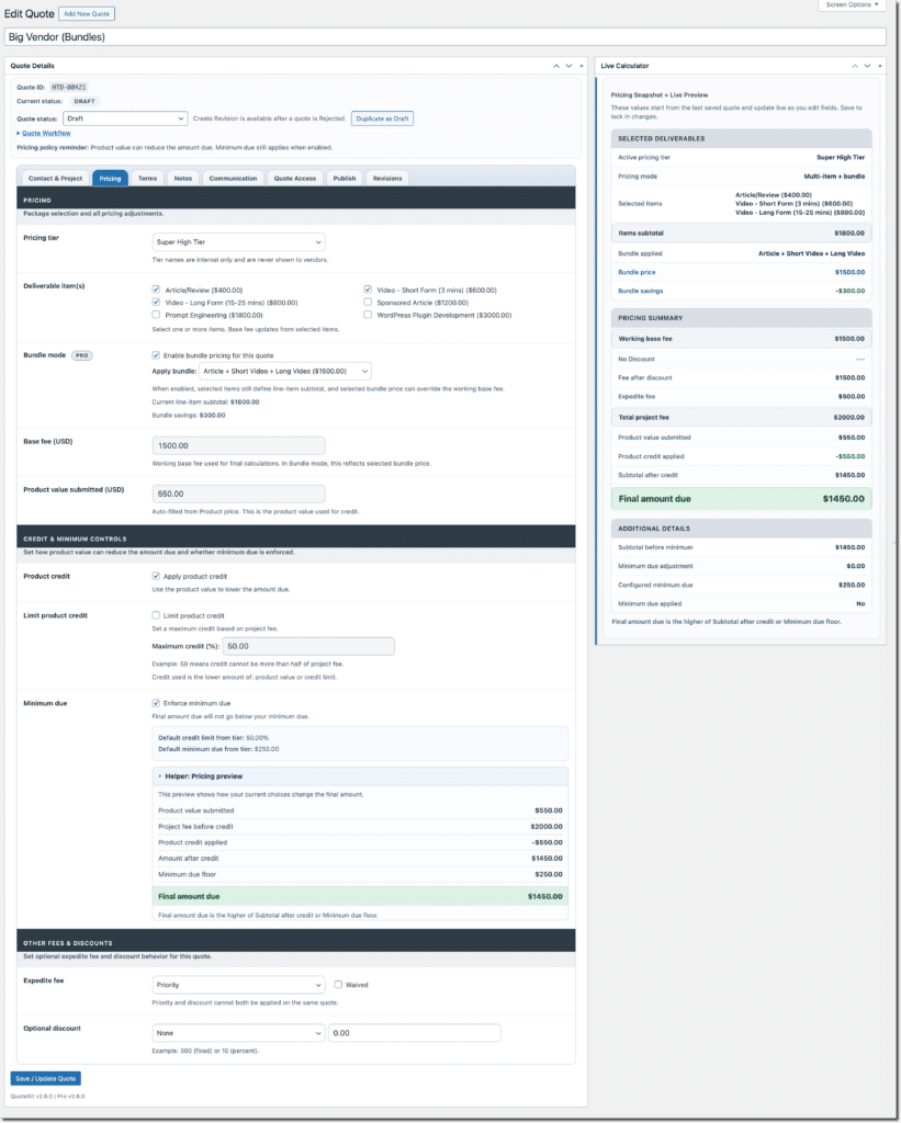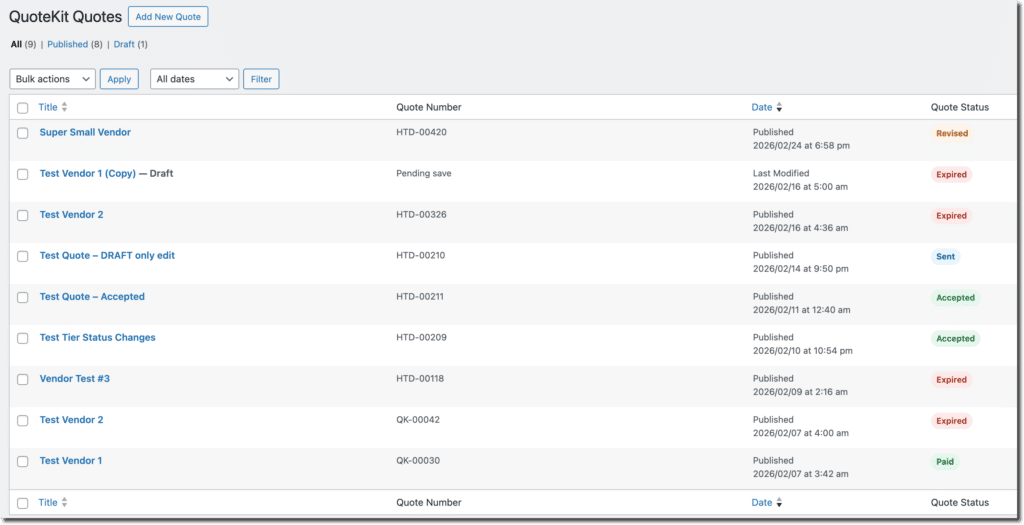 Most quote workflows start simple and become painful fast. Pricing logic drifts across email threads. Quote versions get out of sync. Important details live in three different tools and no one is sure which number is final. QuoteKit fixes that by putting quote creation, pricing logic, vendor response, and lifecycle status in one guided workflow directly inside WordPress.