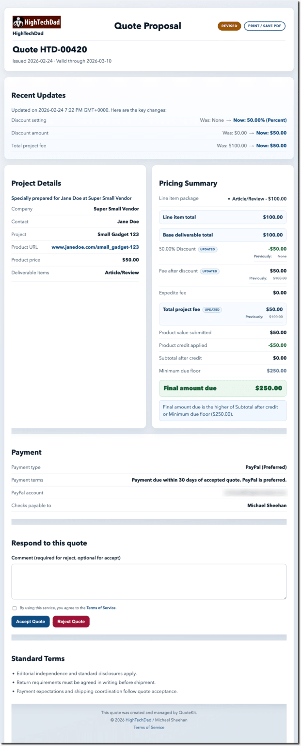 Built and actively used by HighTechDad for real quote workflows.